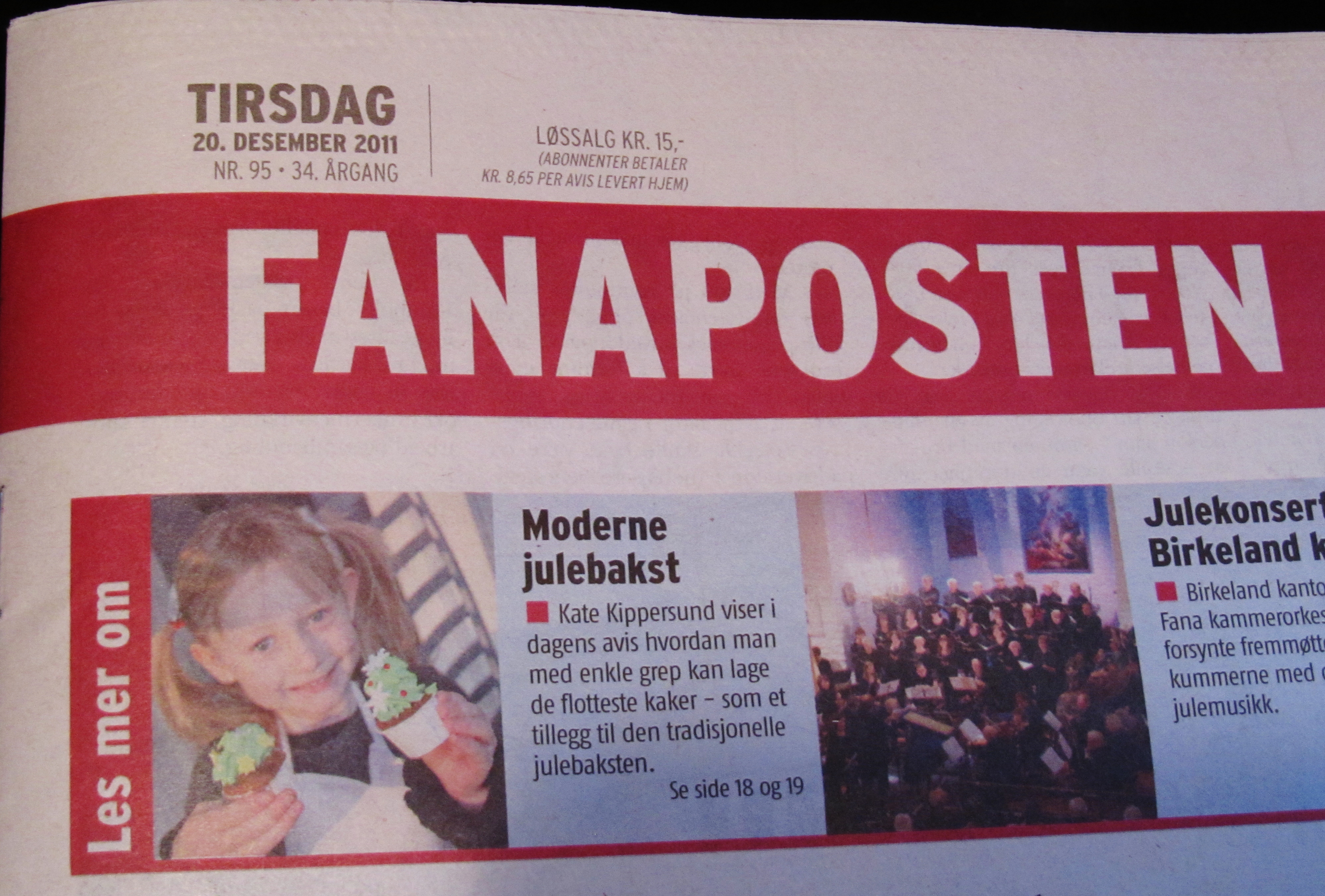 Kan tro jeg har en liten stolt Savannah i dag, som er på forsiden av Fanaposten, etter at avisen var med oss og laget julekaker! Glitrende karamellsnitter, julecupcakes, red velvet mini kaker og “bare må ha” oreokonfekt… Disse oppskriftene kommer til å bli lagt ut etterhvert her på The Flying Cake, ellers kan Fanaposten kjøpes som PDF på www,fanaposten.no